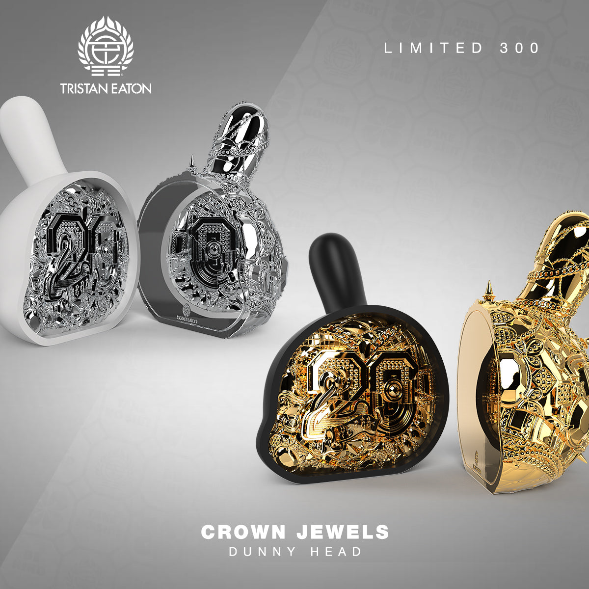 “Crown Jewels” is a majestic spectacle and breath-taking spin on the classic Dunny art form. Playing with the dichotomy of ornate and minimal, this two-toned vinyl Dunny head features one matte black side and one electroplated gold side. The gold side showcases intricate design work with multi-faceted patterns, spikes, and the word “Twenty.” Adding an element of interactive design, the Dunny head separates into two pieces, revealing yet another tribute: the number 20, presented as if it were jewelry.