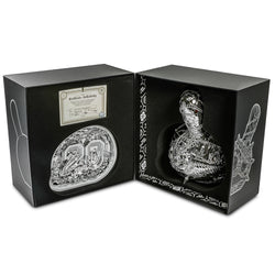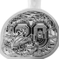 “Crown Jewels” is a majestic spectacle and breath-taking spin on the classic Dunny art form. Playing with the dichotomy of ornate and minimal, this two-toned vinyl Dunny head features one matte white side and one electroplated silver side. The silver side showcases intricate design work with multi-faceted patterns, spikes, and the word “Twenty.” Adding an element of interactive design, the Dunny head separates into two pieces, revealing yet another tribute: the number 20, presented as if it were jewelry.